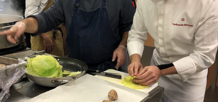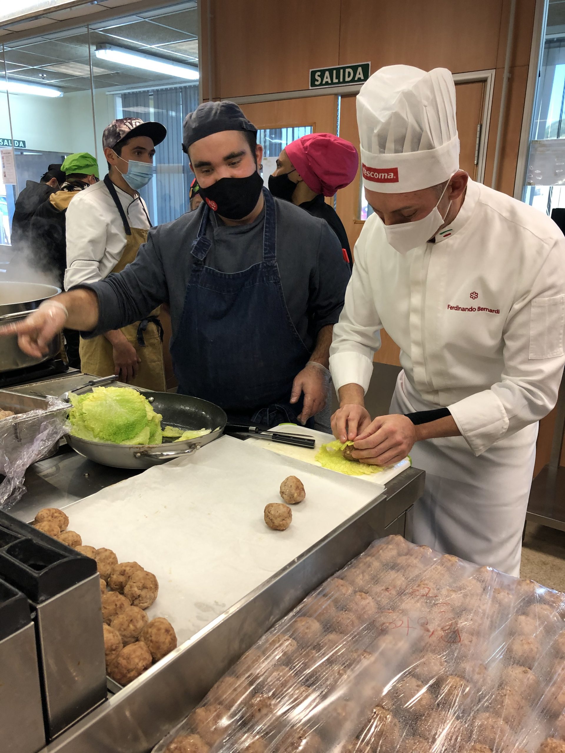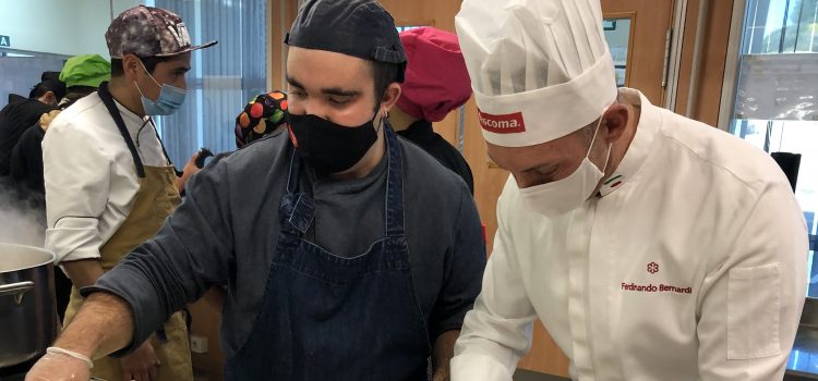 Ferdinando Bernardi y Paco Torreblanca, dos de los referentes de la gastronomía y la repostería alicantina que desde el primer momento se sumaron al proyecto, han participado hoy en la creación de un menú tan especial junto a los voluntarios y estudiantes de los cursos de formación que AGS y la Cámara de Alicante imparten a jóvenes sin formación y en riesgo de exclusión social. Además, Paco Torreblanca ha elaborado una tarta conmemorativa para celebrar con ellos este hito.